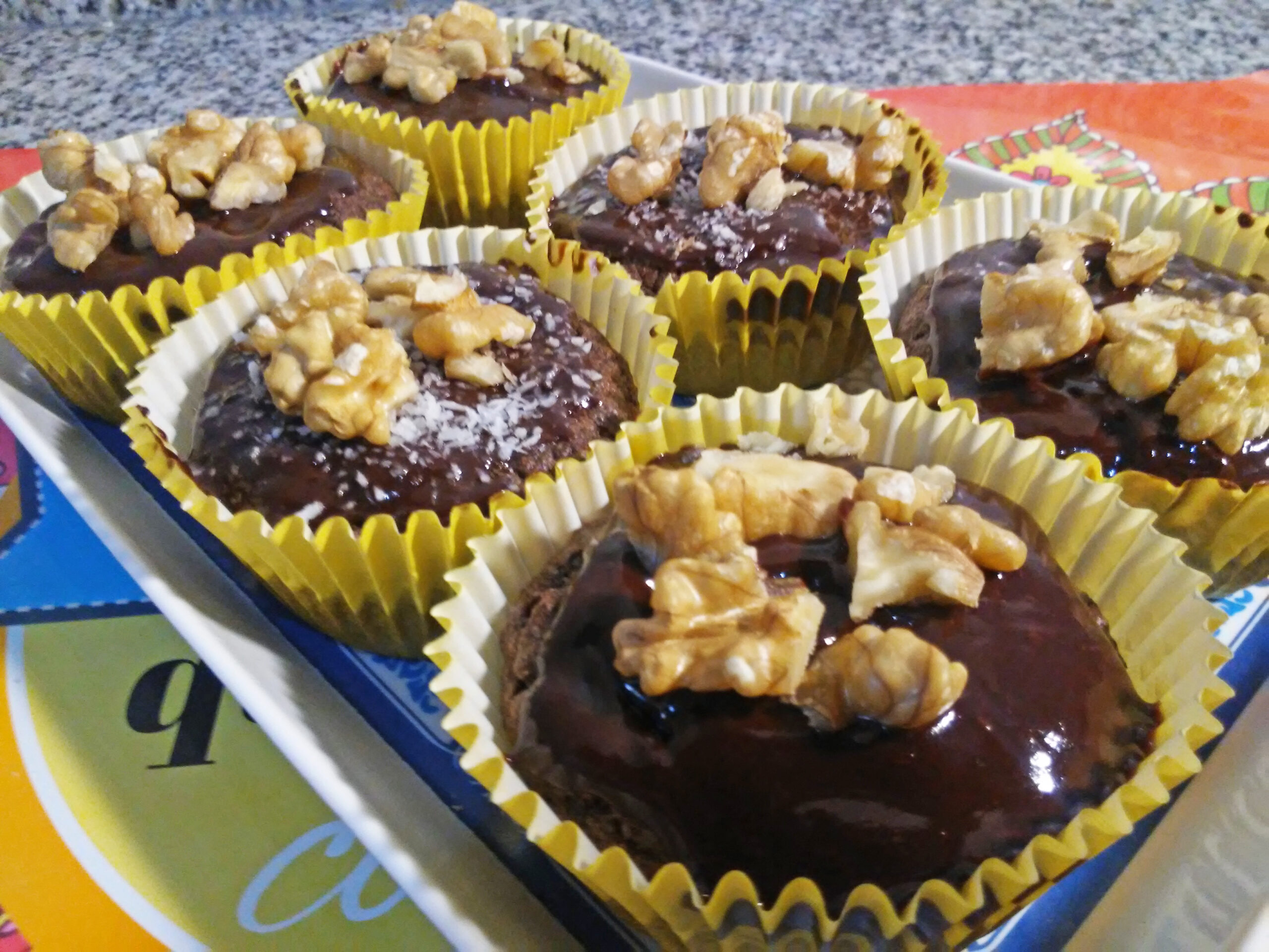 Te enseño como hacer cupcakes o magdalenas con avena, chocolate y harina de algarroba, de manera facil y rápida, cubiertos con chocolate y nueces.